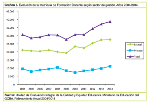 “Respecto de la Evolución de la matrícula de FD, en el Gráfico 3 se observa que la curva del total sigue la forma del comportamiento del sector estatal. El sector estatal presenta tendencia ascendente, entre extremos del período y con mayor intensidad desde 2009 hasta 2014. De 2004 a 2009 la matrícula presenta mayor estabilidad, cayendo de 2007 a 2009.” (2)